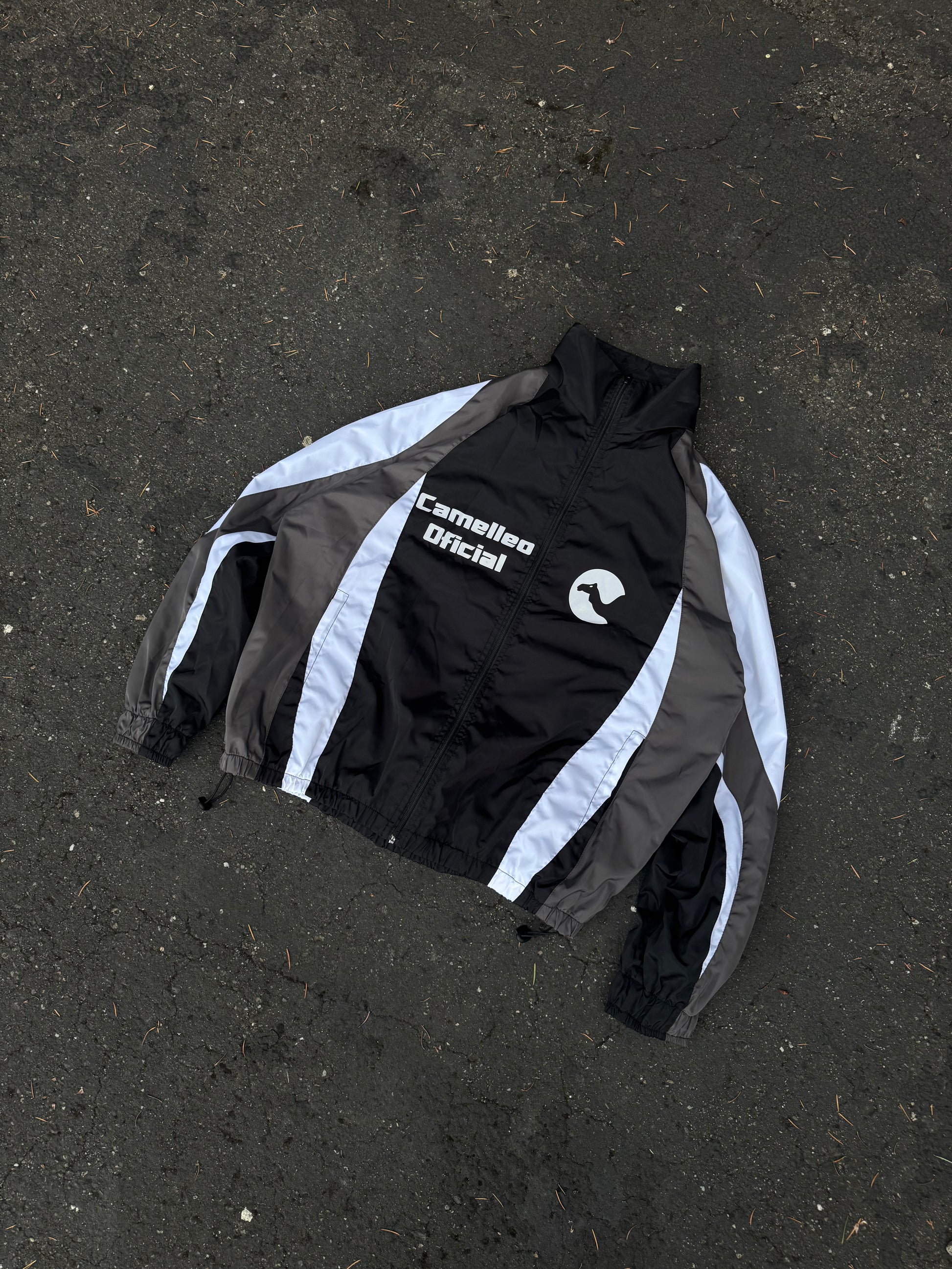 3-color nylon windbreaker design featuring black, dark grey, and white for a bold, modern style.